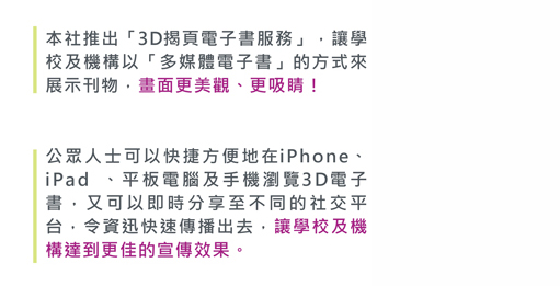 以下是我們提供的3D電子書的收費計劃,如有任何問題,歡迎隨時聯絡我們。電話查詢:(852) 3596 4296 |