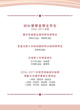 校外獎學金學生芳名 2016-2017 年度 羅氏慈善基金應用學習獎學金 薛皓名 (6C) 蔡穎桐 (6E) 葛量洪青少年制服團隊傑出服務獎學金 吳紫桐 (6D) 全港青少年學業進步 余子筠 (3A) 卓越獎 何澤勝 (3A) 優異獎 2016-2017 年度香港福建同鄉會 獎勵本校優秀畢業生獎學金 一等獎:唐恩琪、謝琦浩 二等獎:吳倍弛、葉浚勳、呂浩銘 三等獎:李丹琳、劉裕城、羅居璇 17 17 17 16 17 16 16 16
