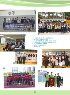 36 37 38 36. 「同行萬里」高中學生內地交流計劃 37. 中一元朗天水圍綠田園活動 38. 65 周年校慶公開課,主題為「傳承 ‧ 創新」 39. 2016 世界奧林匹克機械人競賽榮獲三等獎 40. 69 屆校際音樂節成績優異 41. 田徑比賽榮獲多項獎項 42. 學校水運會 39 40 41 42 27 26 26 27