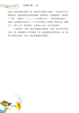 詠物寫人篇 108 說著,她就把筆記遞給了我。娟秀的字體映入眼簾,一想到她今天功 課那麼多,還抽時間出來幫我補課、整理筆記,我感動萬分,輕輕說 了一聲:「謝謝你,一心!」一心對我笑了笑:「這是我應該做的!」 接著,她就開始和我說了一下今天老師課上大概講了甚麼內容,整整 花了一個半小時。直到傍晚,太陽落山之後,她才和我道別。 一心做的每一件事,都仍然讓我記憶猶新。她是一個以身作則的 班長,是一個尊重他人的聆聽者,是一個處處幫助我的朋友,是一個 努力學習的同學,也是一個品學兼優的好榜樣。