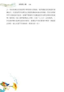詠物寫人篇 138 人,他的見識往往對我們升學有極大的幫助,縱然講者沒有高超的演 講技巧,可是我們作為學生必須要對講者有基本的尊重,而非在禮堂 呼呼大睡或談天說地。這種不尊重的行為難道是作為學生應有的態度 嗎?面對每一個人我們都應虛心求教,只因「三人行,必有我師」, 作為我們應付起學生基本的責任,更應從不同的事情中學習。尊重是 必須的,虛心也是不可或缺的,態度決定一切。