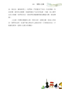159 智慧人生篇 金、馬拉拉、屠呦呦等人,他們無一不是看淡了失去,失去青春,失 去安穩,甚至失去健康,但最終握住了自己的長處、力量,為人類作 出巨大貢獻。他們的失去,使他們的貢獻顯得更加難能可貴,更加輝 煌! 人生是一列開往墳墓的火車,得失也好,成敗也罷,因為人的信 念,我們失去的,永遠不會比現在手上握住的多。只有看淡失去,才 能握住更多,追尋人生更大的價值。