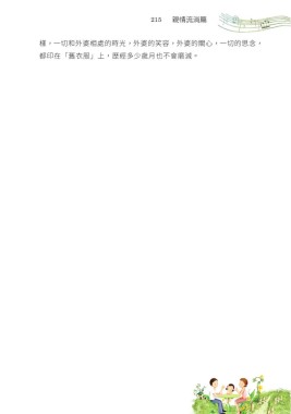 215 親情流淌篇 樣,一切和外婆相處的時光,外婆的笑容,外婆的關心,一切的思念, 都印在「舊衣服」上,歷經多少歲月也不會磨滅。