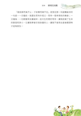 219 親情流淌篇 「樹欲靜而風不止,子欲養而親不在」是我在那一刻感觸最深的 一句話。一分鐘前,我還在等待外祖父,等待一個孝順他的機會;一 分鐘後,一切都變得支離破碎。這次生死間的等待,讓我認識了生命 的脆弱和渺小,它讓我學會珍惜身邊的人,讓我不會再在最後關頭時 才追悔莫及。