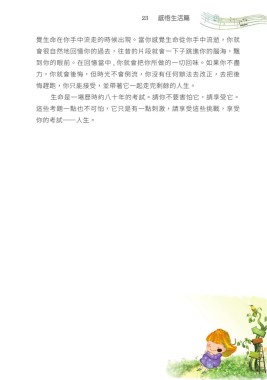 23 感悟生活篇 覺生命在你手中流走的時候出現。當你感覺生命從你手中流逝,你就 會很自然地回憶你的過去,往昔的片段就會一下子跳進你的腦海,飄 到你的眼前。在回憶當中 , 你就會把你所做的一切回味。如果你不盡 力,你就會後悔,但時光不會倒流,你沒有任何辦法去改正,去把後 悔趕跑,你只能接受,並帶著它一起走完剩餘的人生。 生命是一場歷時約八十年的考試。請你不要害怕它,請享受它。 這些考題一點也不可怕,它只是有一點刺激,請享受這些挑戰,享受 你的考試─人生。
