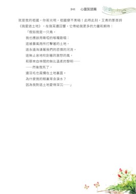 241 心靈絮語篇 就是我的祖國,你若光明,祖國便不黑暗!此時此刻,艾青的那首詩 《我愛這土地》,在我耳邊回響,它帶給我更多的力量和期待: 「假如我是一只鳥, 我也應該用嘶啞的喉嚨歌唱: 這被暴風雨所打擊著的土地, 這永遠洶湧著我們的悲憤的河流, 這無止息地吹刮著的激怒的風, 和那來自林間的無比溫柔的黎明…… ——然後我死了, 連羽毛也腐爛在土地裏面。 為什麼我的眼裏常含淚水? 因為我對這土地愛得深沉……」