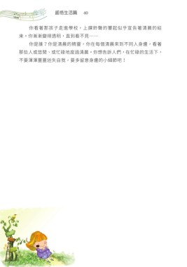 感悟生活篇 40 你看著那孩子走進學校,上課鈴聲的響起似乎宣告著清晨的結 束。你漸漸變得透明,直到看不見…… 你是誰?你是清晨的精靈,你在每個清晨來到不同人身邊,看著 那些人或悠閒、或忙碌地度過清晨。你想告訴人們,在忙碌的生活下, 不要渾渾噩噩迷失自我,要多留意身邊的小細節吧!