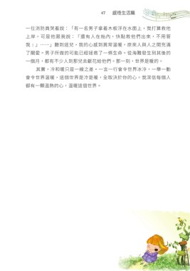 47 感悟生活篇 一位消防員哭着說:「有一名男子拿着木板浮在水面上,我打算救他 上岸,可是他跟我說:『還有人在船內,快點救他們出來,不用管 我﹗』……」聽到這兒,我的心感到異常温暖,原來人與人之間充滿 了關愛。男子所做的可能已經拯救了一條生命。從海難發生到其後的 一個月,都有不少人到那兒去獻花給他們。那一刻,世界是暖的。 其實,冷和暖只是一線之差。一言一行會令世界冰冷,一舉一動 會令世界温暖,這個世界是冷是暖,全取決於你的心。我深信每個人 都有一顆温熱的心,溫暖這個世界。