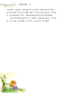 感悟生活篇 60 不能知曉。正因如此,我們面對他人的缺失時,應該沉着心中的怒火, 給予他人體諒,給予他人尊嚴。體諒,於這自私自利的社會,是必要 的。對身陷困境的人而言,體諒是鼓勵他們好好生活的最佳靈藥。 我在午飯時間為年輕人買了一盒便當,希望藉此告訴他:他的故 事,有人知曉;他的遭遇,有人明白;他的失誤,有人體諒。