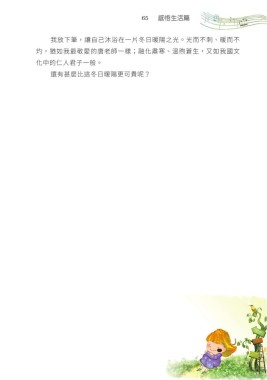 65 感悟生活篇 我放下筆,讓自己沐浴在一片冬日暖陽之光。光而不刺、暖而不 灼,猶如我最敬愛的唐老師一樣;融化肅寒、溫煦蒼生,又如我國文 化中的仁人君子一般。 還有甚麼比這冬日暖陽更可貴呢?