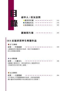 福中人 / 校友訪問 ◆楊孫西校董 010 ◆洪錦鉉校友 016 ◆吳栢楠校友 020 觀塘照片集 024 IES 社區研習學生專題作品 ◆ 6F 任樂桐 政策─市區重建 029 以觀塘裕民坊重建項目為例,探討市區重建對市 民生活質素的影響。 ◆ 6A 譚詩韻 政策─工廈活化 046 從觀塘工業區活化,探討政府活化工廈政策在多 大程度有利本港年青人創業。 ◆ 6D 梁靖珩 政策─公屋重建 064 以牛頭角上村和觀塘樂華村為例,你認為房屋重 建計劃是否能夠幫助市民改善及提升生活質素?