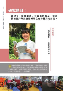 0 0 0 研究題目: 福建中學 六十五週年 從現今 「遊戲權利」在香港的普及 ,探討 觀塘區戶外兒童遊樂場之充分性及完善性。 通識科紀念特刊 研究範疇: 社區配套 ─ 兒童遊樂設施 我 建議邀請感覺統合治療師提供設計意見,使遊樂場設施更能配合 小孩的成長和發展。此外,在每個遊樂設施旁提供使用說明,這 可有助家長按照子女的需要引領學習玩樂,例如在資料中說明該設施 可訓練小孩的前庭感。─ 6B 歐旖雯