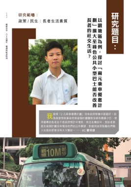 研究題目: 0 0 研究範疇: 0 長者的社交生活? 劃」擴大至綠色公共小型巴士能否改善 以觀塘區為例,探討「兩元乘車優惠計 政策 / 民生:長者生活素質 福建中學 六十五週年 通識科紀念特刊 我 發現「2 元乘車優惠計劃」沒有政府想像中那麼好。因 為我發現就算政府將這個計劃擴展至綠色專線小巴,使 用優惠的長者並不是政府預計中增長,而且在專訪中,受訪者更 提及這個計劃沒有增加他們的出外願望,對達到政府鼓勵他們融 入社區的原意沒有太大幫助。─ 6C 霍琛諺