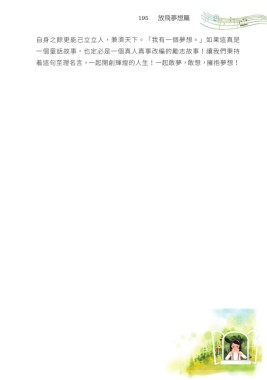 195 放飛夢想篇 自身之餘更能己立立人,兼濟天下。「我有一個夢想。」如果這真是 一個童話故事,也定必是一個真人真事改編的勵志故事!讓我們秉持 着這句至理名言,一起開創輝煌的人生!一起敢夢,敢想,擁抱夢想!
