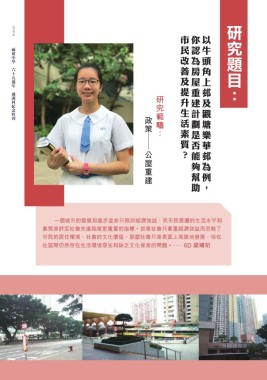 研究題目: 0 0 0 市民改善及提升生活素質? 你認為房屋重建計劃是否能夠幫助 以牛頭角上邨及觀塘樂華邨為例, 福建中學 六十五週年 通識科紀念特刊 研究範疇: 政策 — 公屋重建 一個城市的發展和進步並非只限於經濟效益,而市民普遍的生活水平和 素質是評定社會先進程度更重要的指標。如果社會只着重經濟效益而忽略了 市民的居住環境、社會的文化價值,那麼社會只是表面上高速地發展,但在 社區間仍然存在生活環境惡劣和缺乏文化保育的問題。─ 6D 梁靖珩